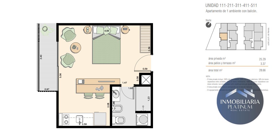– Superficie total de 33 m² (29 m² cubiertos y 4 m² descubiertos).